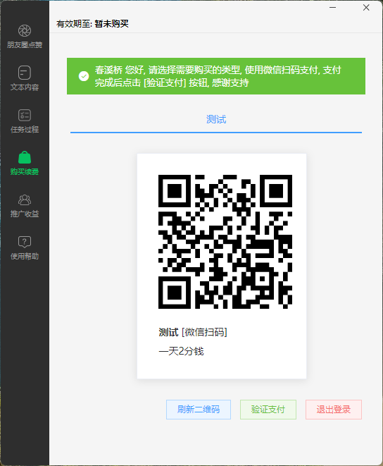 3、登录以后,可以通过两种方式购买软件使用能力,可以通过直接扫码支付,购买完成后点击验证支付按钮,也可以通过联系平台人员购买序列号,通过
